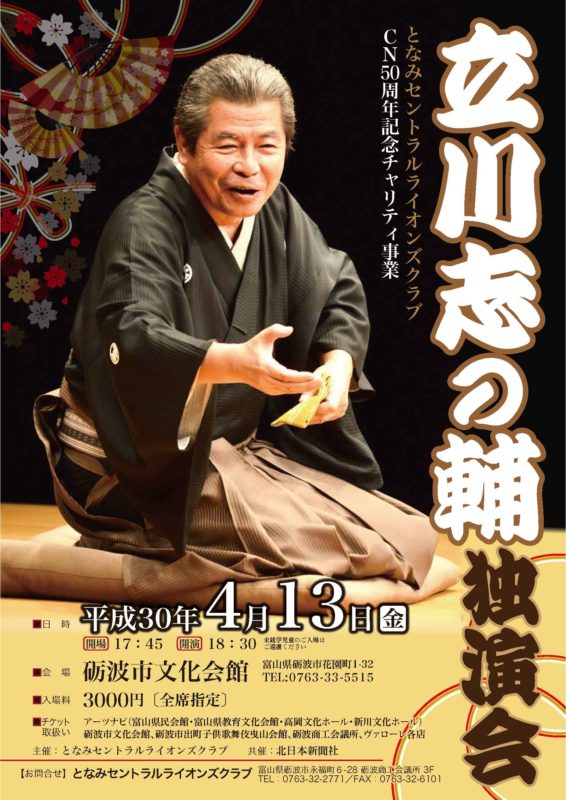 CN50記念事業として『立川志の輔独演会』を開催し、その収益金を砺波市の公共の福祉のために役立てていただくこととした。 4月13日(金)砺波市文化会館は立川志の