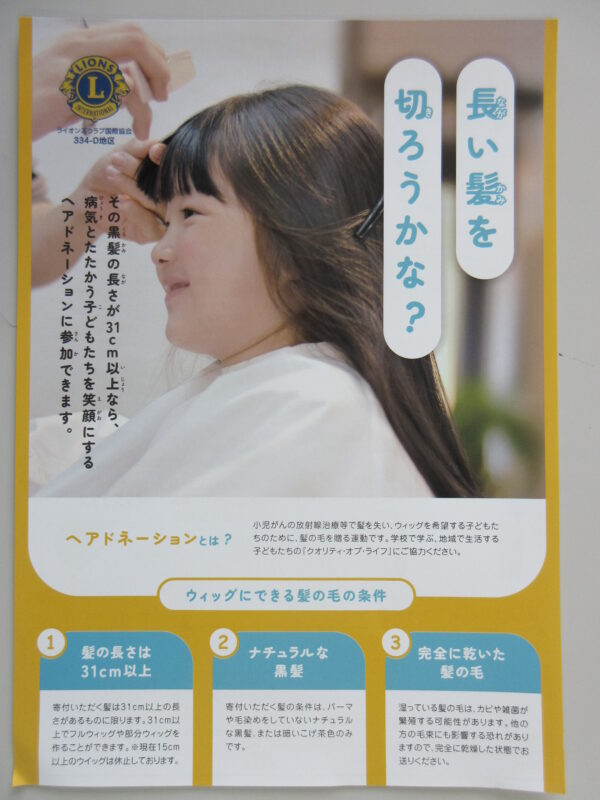 今年度、会長肝いりのアクティビティとして「ヘアードネーション啓発運動」を行っています。砺波美容組合・砺波市内の小中学校・砺波高校の皆さんにもご協力頂きヘアードネ